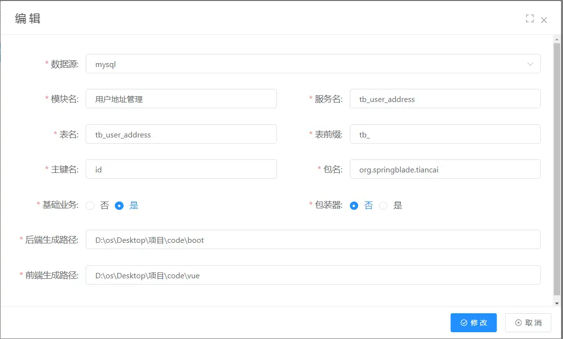 数据源选择上一步配置好的,模块名是表的中文名,服务名是生成后数据的业务名,表名tb_user_address,前缀_tb,包名是是代码路径,业务基础包装器生成路径按需求定义